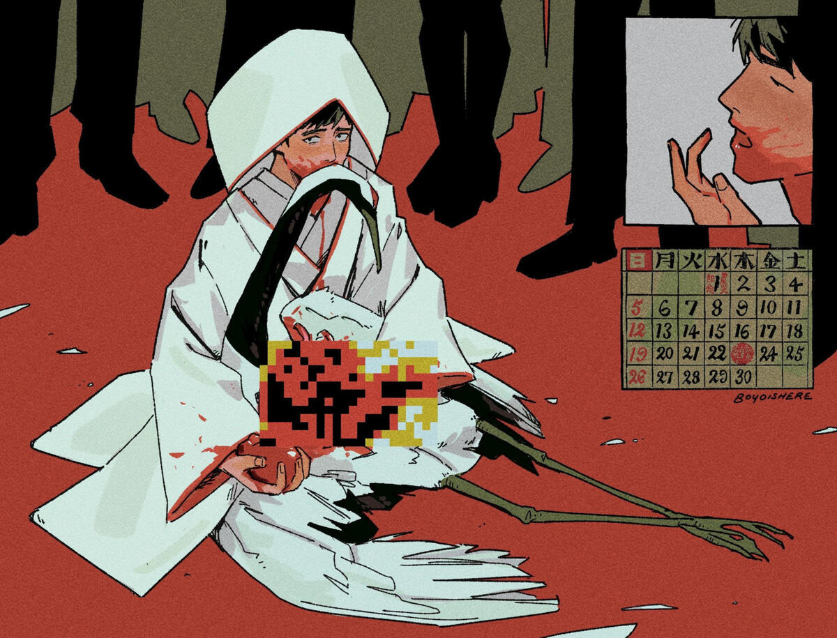 昭和間,京都葛野某商娶婿角藤氏。角藤氏弱冠,貞靜整齊,親家俱愛之。婚日,新人入社爲儀,儀畢,下殿宴客。菜過五味,新婿謂如廁。三更,新郎半酣,忽聞殿後圍眾嘩然,因由中穿入,方見新婿跪地,血濺打掛,膝上一鶴屍,腔敞脅開,腸胃暴盡。新婿銜其頸,又弄其臟腑,卽相視,竟顏漠如生,俄而掏心遞之。新郎駭,不敢動。眾鬨,以爲妖,正商決,則新婿起,抱鶴疾出。公差夜尋,終無蹤兆。嗣後三年,鄰郡時發鶴盜案,皆無果。